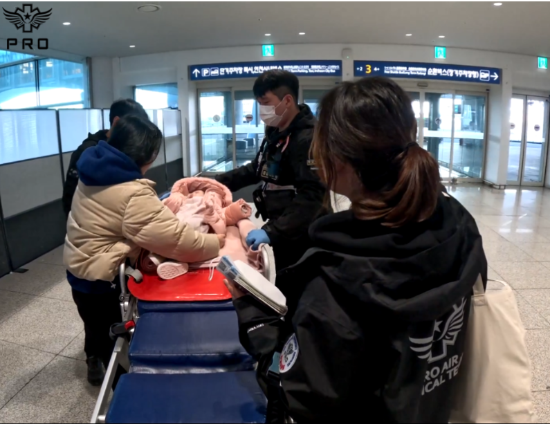 기내에서 산소호흡기를 사용하면서 이송하였고